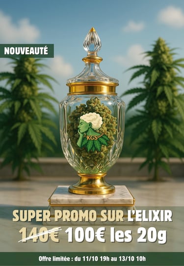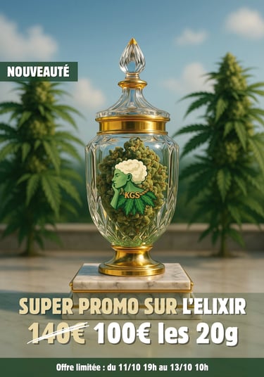 Un flacon de cristal aux reflets dorés révèle une fleur CBD dense et raffinée, mise en valeur par un ciel lumineux et des plantations élancées. La scène, élégante et contemporaine, confère à l’Elixir un caractère unique, digne des plus belles variétés