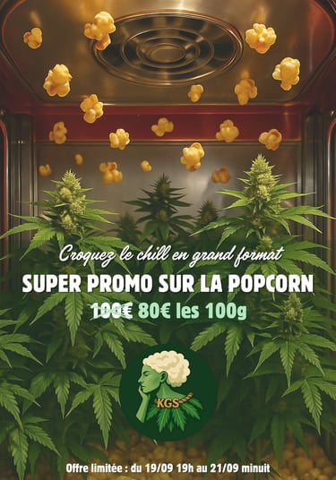 Dans l’éclat métallique d’une machine à pop-corn rouge, grains dorés figés en plein vol côtoient une jungle de CBD réaliste et dense. Une atmosphère gourmande, festive et surréaliste.