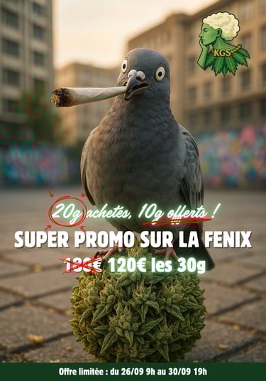 Un pigeon urbain, au regard ébahi, trône sur une tête de CBD Fénix surdimensionnée. L’humour absurde se mêle à un réalisme photoréaliste, dans une ambiance citadine décalée et percutante.