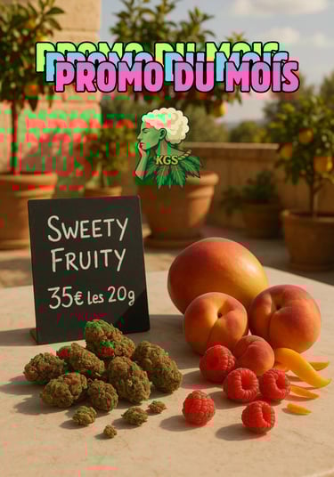 Sous le soleil d’une terrasse méditerranéenne, la Sweety Fruity s’expose parmi des fruits frais dans une ambiance douce et lumineuse. L’ardoise artisanale inscrit le nom et le prix de la variété, soulignant un univers naturel, gourmand et élégant