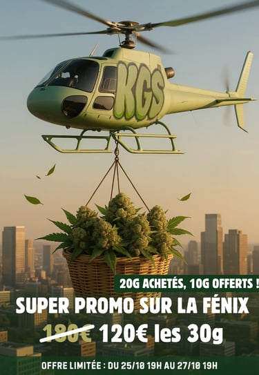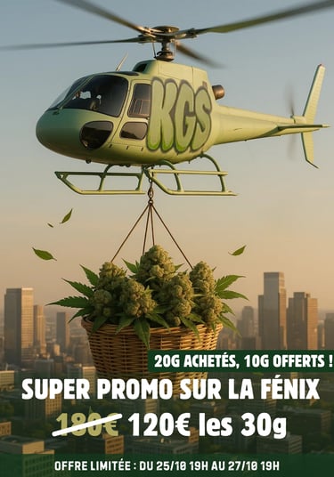 Au dessus d'une métropole moderne, l’hélicoptère vert KGS survole la ville en transportant une récolte luxuriante de Fénix. Une scène audacieuse et aérienne, symbole de puissance et de légèreté à la fois.
