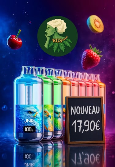 Une composition éclatante et hyperréaliste où la gamme Puff JNR Falcon Gem+ 30K s’impose dans un univers fruité, frais et lumineux.
