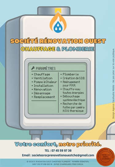 Le logo associe feu et eau pour symboliser la complémentarité entre chauffage et plomberie, tandis que l’affiche, inspirée d’un écran de chaudière, met en avant les services avec précision et équilibre visuel.
